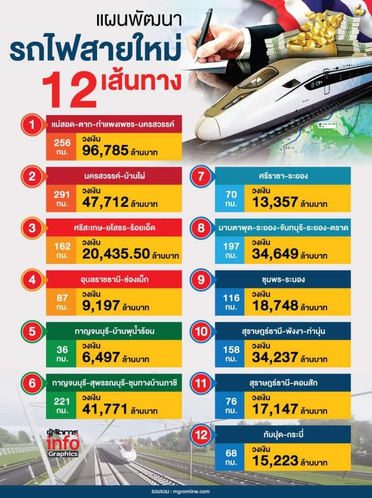 และรถไฟสายใหม่ที่ ครม.อนุมัติโครงการแล้ว 2 เส้นทาง ระยะทางรวม 678 กม. วงเงินรวม 128,379 ล้านบาท คือ ช่วงเด่นชัย-เชียงราย-เชียงของและ ช่วงบ้านไผ่-มุกดาหาร-นครพนม