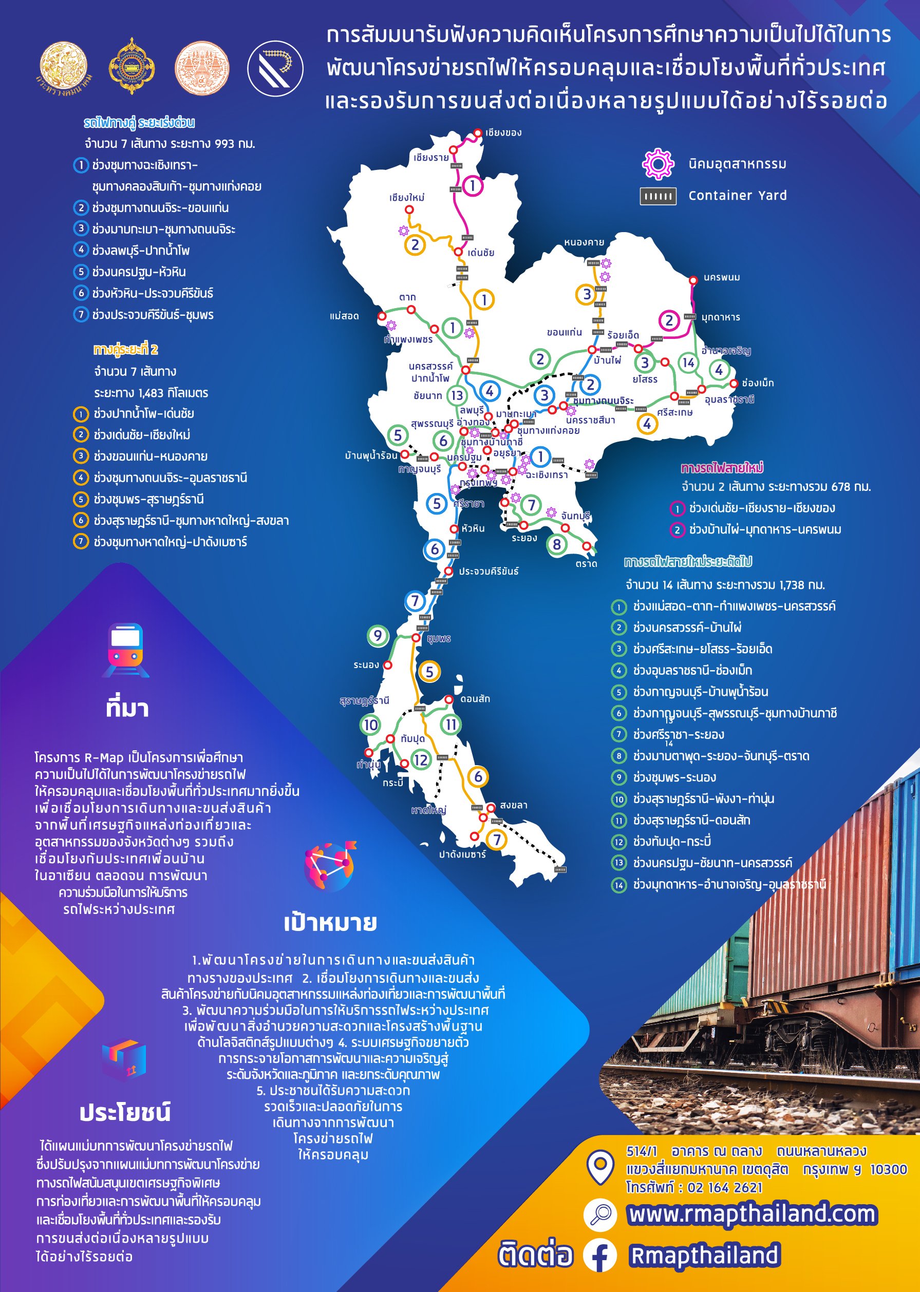 ทั้งนี้ สำหรับการสัมมนา R-Map ในครั้งนี้เป็นการเผยแพร่ข้อมูลโครงการ และสร้างการรับรู้และความเข้าใจ เกี่ยวกับโครงการแก่กลุ่มเป้าหมายให้ได้รับทราบ รวมถึงเปิดโอกาสในการรับฟังความคิดเห็นและข้อเสนอแนะจากหน่วยงานภาครัฐ เอกชน และประชาชน เพื่อนำมาประกอบการศึกษาโครงการ โดยมีขอบเขตการศึกษา 4 ส่วนประกอบด้วย 1.การทบทวน สำรวจ รวบรวมข้อมูลผลการศึกษาและการดำเนินงานของแผนงานโครงการต่างๆ ที่เก่ียวข้อง 2.การศึกษาวิเคราะห์แนวทางการพัฒนาโครงข่ายรถไฟให้ครอบคลุมและเชื่อมโยงพื้นที่ทั่วประเทศฯ 3.การจัดทำแผนพัฒนาโครงข่ายรถไฟให้ครอบคลุมและเชื่อมโยงพื้นที่ทั่วประเทศฯ โดยสอดคล้องกับยุทธศาสตร์ชาติ และ 4.การมีส่วนร่วมของประชาชน เพื่อให้ดำเนินการศึกษาดังกล่าวเกิดความครบถ้วน สมบูรณ์ และเกิดผลประโยชน์ต่อประชาชนและประเทศต่อไป